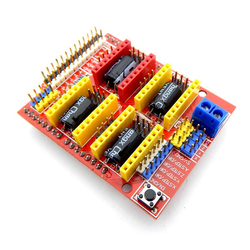 Плата розширення CNC Shield V3 сумісна з контролерами Arduino. За допомогою Arduino CNC Shield V3.0, Ви зможете самостійно зібрати та запрограмувати гравіювальні верстати та 3D принтери. Плата розширення Ардуїно виконана у вигляді накидного шилда і може підключатися поверх Arduino, не вимагаючи зовнішніх підключень і проводки. На платі є 4 слоти для підключення модуля приводу крокового двигуна, кожен з яких може управляти 1 кроковим двигуном. Для управління кожним кроковим двигуном потрібно тільки два контакти вводу - виводу на Arduino. Просто вставте цей Arduino CNC Shield V3.0 в Arduino UNO та встановіть прошивку GRBL, після чого, Ви зможете швидко побудувати саморобний гравіювальний верстат з ЧПУ.